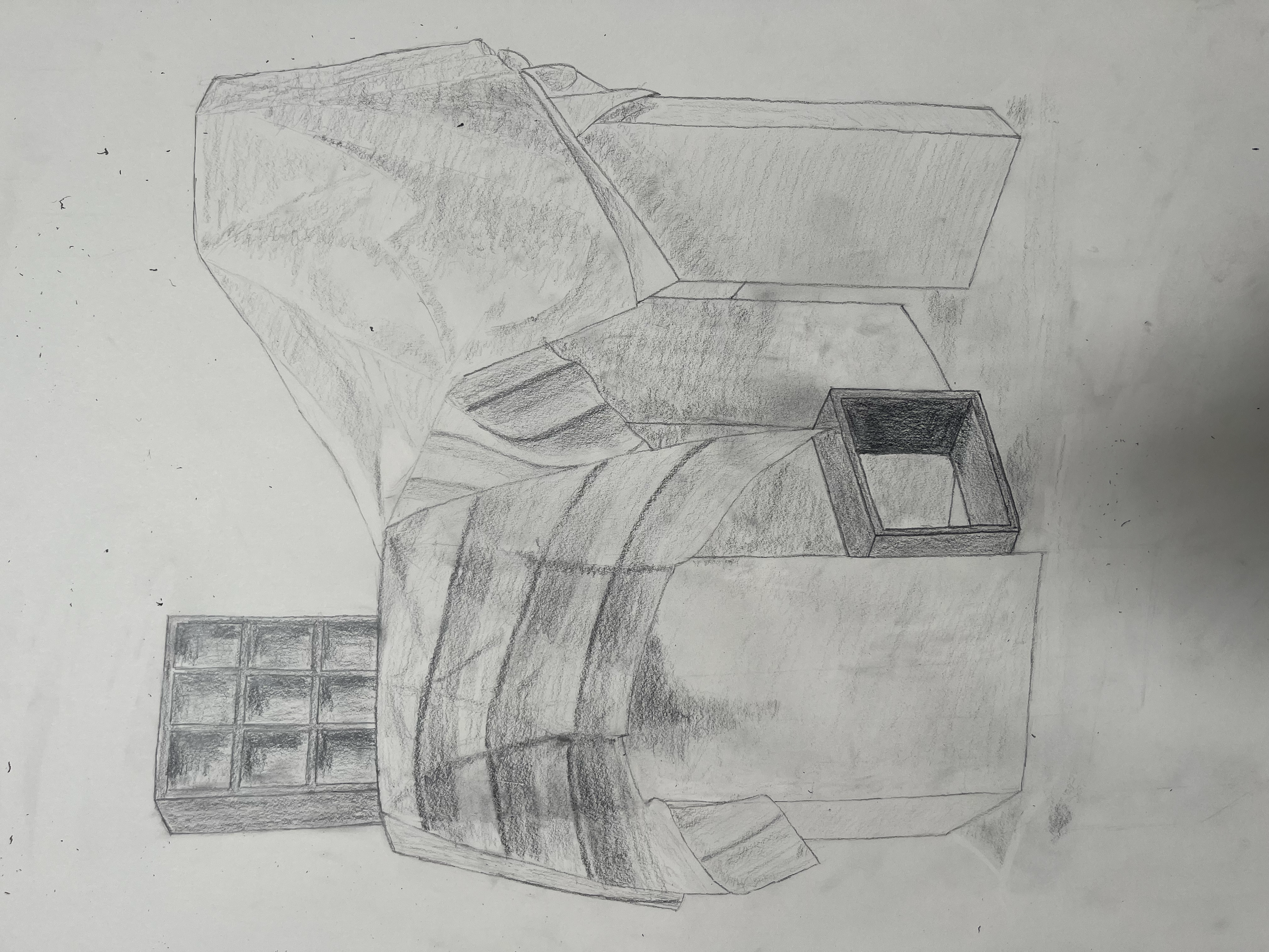 For this piece we had to pick 2 objects from the set up above and construct an original composition inspired by them. In addition, we had to fill the whole paper and had to use charcoal and charcoal pastels but no pencils or graphite. I struggled a lot with this one because normal charcoal made some noise that was driving me crazy so I exclusively used the pastels. They were so messy but fun nonetheless. I also used tape to create that empty space in the middle which was intended to highlight the verticality of the piece. Unfortunately, it turned out you use tape on canvas, so it did tare a bit of the paper, but it doesn’t really show. I loved all the different textures I managed to create, and although I didn’t do the best job of recreating the tree crown my head-like looking version still looks somewhat good.
